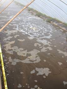 江苏如东大豫镇钱老板,南美白虾小棚养殖,小棚面积大约7分地,水色为浓绿色。养殖40天左右有一个小棚出现死藻现象,死藻覆盖全部水面,只有在增氧机附近能够看清水体。养殖户使用过各种产品如解毒产品、EM菌等,但是效果不太理想。使用“水の优选”和“底の优选”各300ml,5-7天后几乎没有死藻,水色变得清爽。